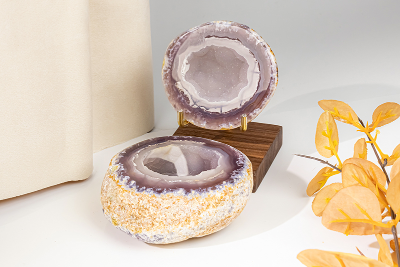 將瑪瑙晶洞切開,以有蓋的碗狀呈現,俗稱聚寶盆,是很人氣的風水擺飾,