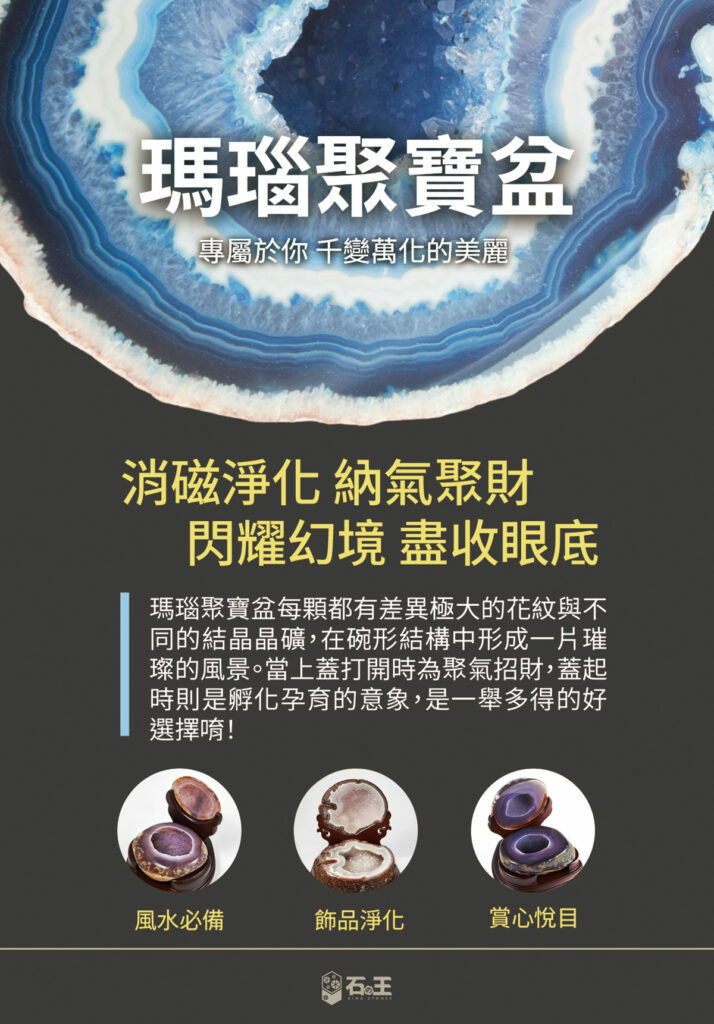 將瑪瑙晶洞切開,以有蓋的碗狀呈現,俗稱聚寶盆,是很人氣的風水擺飾,