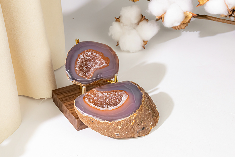 將瑪瑙晶洞切開,以有蓋的碗狀呈現,俗稱聚寶盆,是很人氣的風水擺飾,